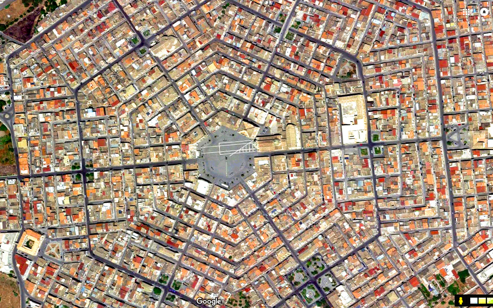 Grammichele has a hexagonal plan that could be potentially extended indefinitely. The hexagonal plan designed for Grammichele is divided into six sectors by six roads all converging towards the main square, that is hexagonal too, on which public offices overlooked.